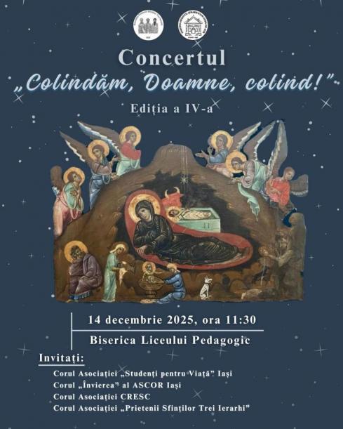 Asociația „Prietenii Sfinților Trei Ierarhi”, în parteneriat cu Parohia „Sfântul Ioan Gură de Aur” – Copou, organizează ediția a IV-a a concertului de colinde „Colindăm, Doamne, colind”. Evenimentul va avea loc la Biserica „Sfinții Trei Ierarhi” din cadrul Colegiului Național Pedagogic „Vasile Lupu” Iași. Concertul va fi susținut de tinerii din corurile asociațiilor din cetatea Iașilor: corul Asociației „Studenți pentru Viață” Iași, corul „Învierea” al ASCOR Iași, corul Asociației CRESC, alături de corul Asociației organizatoare.