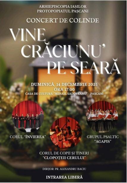 Arhiepiscopia Iașilor, prin Protopopiatul Pașcani, organizează, de la ora 17. 00, concertul de colinde „Vine Crăciunu’ pe seară”, găzduit de Casa de Cultură „Mihail Sadoveanu” din Pașcani. În cadrul evenimentului vor urca pe scenă Corul „Învierea”, Grupul Psaltic „Agapis” și Corul de Copii și Tineri „Clopoțeii Cerului”. Concertul va fi dirijat de părintele Alexandru Baciu, iar accesul publicului este liber.