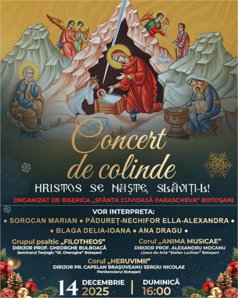 La Parohia „Sfânta Cuvioasă Parascheva” din Botoșani, începând cu ora 16.00, va avea loc concertul de colinde intitulat: „Hristos Se naște, slăviți-L”. La manifestare vor fi prezenți invitații: Marian Sorocan, Ella-Alexandra Pădureț-Nechifor, Delia-Ioana Blaga și Ana Dragu. Vor participa, de asemenea, grupuri și coruri consacrate: Grupul psaltic „Filiotheos”, dirijat de Prof. Gheorghe Bulboacă, Corul „Anima Musicae”, dirijat de Prof. Alexandru Mocanu, și Corul „Heruvimii”, coordonat de Pr. Capelan Brașoveanu Sergiu Nicolae. Evenimentul își propune să aducă în sufletele participanților atmosfera tradițională a colindelor și bucuria sărbătorii Nașterii Domnului.